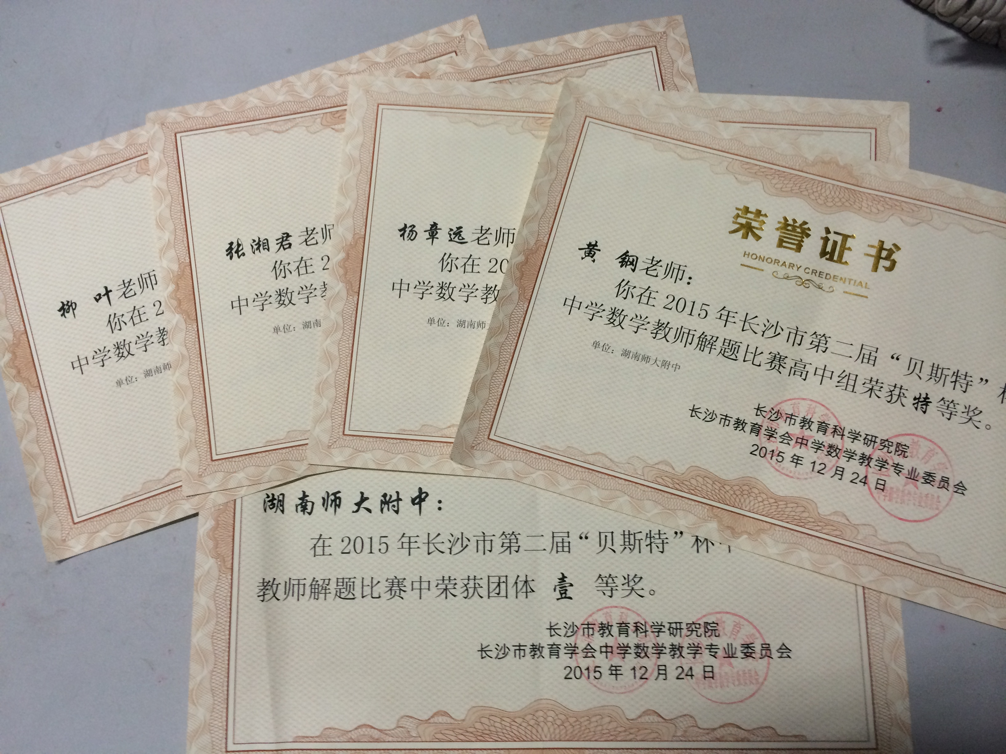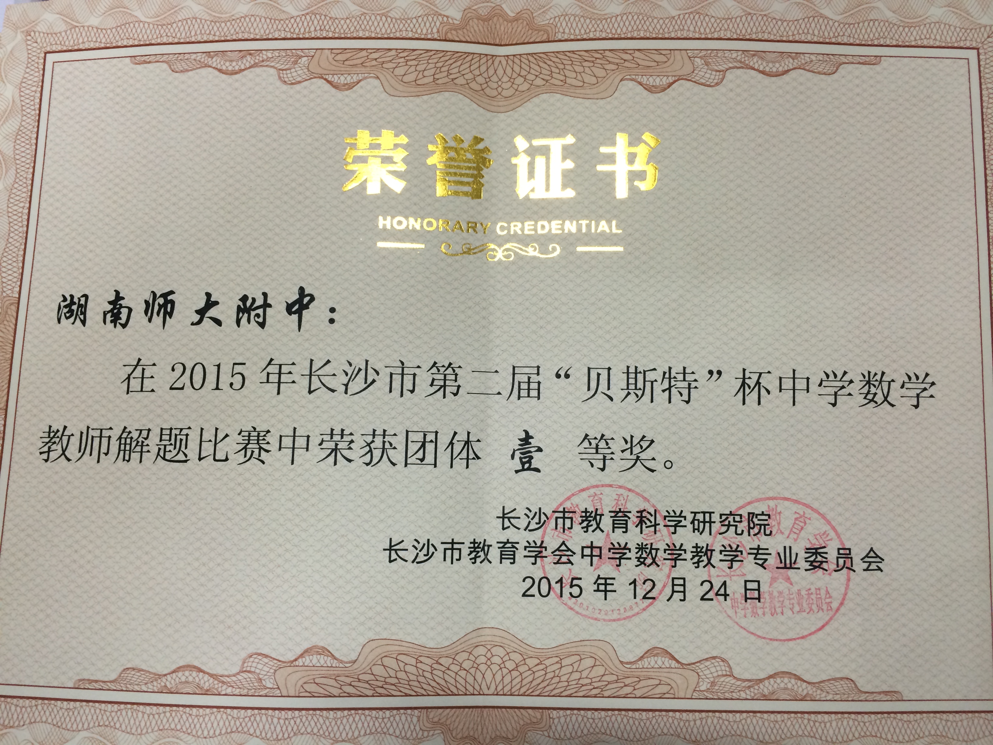 新闻中心 附中新闻 通知公告 最新动态 教育视点 集团学校新闻联播 媒体聚焦 工作安排 微信附中 喜报:我校荣获长沙市第二届中学数学教师解题竞赛高中组团体一等奖 发布:管理员 来源:未知 日期:2016-01-06 人气:分享到: 近日,长沙市第二届中学数学教师解题能力大赛结果揭晓,我校数学教研组四位参赛教师经过努力拼搏,均取得了优异成绩。其中杨章远、黄钢老师获特等奖,张湘君、柳叶老师获一等奖,我校荣获高中组团体总分一等奖(团体最高奖为一等奖)。 杨章远、黄钢老师晋级湖南省中学数学教师解题能力大赛决赛,分别获得特等奖和一等奖。 谨此,特向全校师生员工报喜,并向以上老师及数学教研组表示祝贺! 上一篇:2016年新年贺词 下一篇:同济大学给我校发来感谢信 通知公告 更多 湖南师范大学附属中学2024年度废 湖南师范大学附属中学化学实验室 湖南师范大学附属中学出国(境) 关于开展2024年暑假教科研论文评 湖南师范大学附属中学2024年暑假 关于申报“十四五”课题2024年度 最新动态 更多