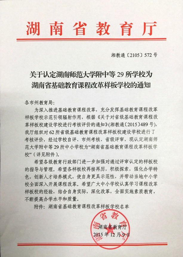 新闻中心 附中新闻 通知公告 最新动态 教育视点 集团学校新闻联播 媒体附中 工作安排 微信附中 我校被认定为湖南省基础教育课程改革样板校 发布:党委办公室 来源:校办公室 日期:2016-01-07 人气:分享到: 近日,接湖南省教育厅湘教通【2015】572号文件,我校被认定为湖南省基础教育课程改革样板校。 上一篇:同济大学给我校发来感谢信 下一篇:我校与长沙县人民政府签订合作办学协议 通知公告 更多 关于征集湖南师大附中“十五五” 湖南师大附中2026年教师招聘(第 湖南师大附中2025年教育教学成果 湖南师范大学附属中学2025年零星 关于举办第40届校园文化艺术节的 湖南师范大学附属中学2026年教师 最新动态 更多