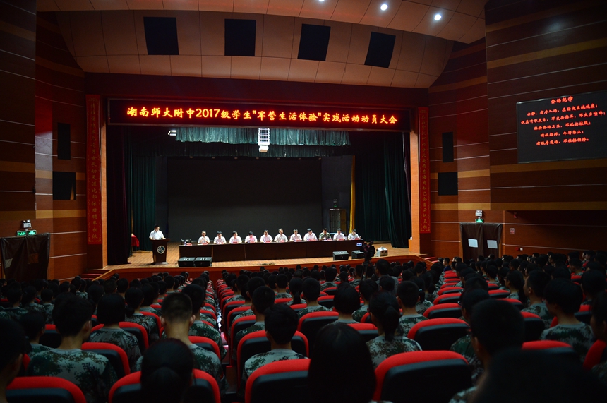 大会在庄严的国歌、校歌声中拉开帷幕。陈迪勋副校长作军训动员讲话。他分析了当前的国际形势,回顾了我校“军营生活体验”实践活动开展的历史,介绍了今年“军营生活体验”实践活动的背景、意义和内容,对全体参训同学提出了三点要求和希望:一、以饱满的热情,积极的态度投身军事训练;二、以军人标准严格要求自己,一切行动听指挥;三、以附中人身份要求自己,讲文明、树新风。教官代表周江讲话,他对湖南农业大学武装部及参加此次活动的教官进行了介绍,表示将大力支持、认真扎实的做好训练组织工作。