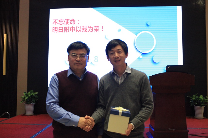 在主持人精心准备的神秘环节中,1994届校友唐劲松为不远千里来参加联谊会的老师们各赠送了一套“防霾神器”;筹委会为当天过生日的1989届校友赵强送上了生日蛋糕,老师们和“寿星”都备受感动。