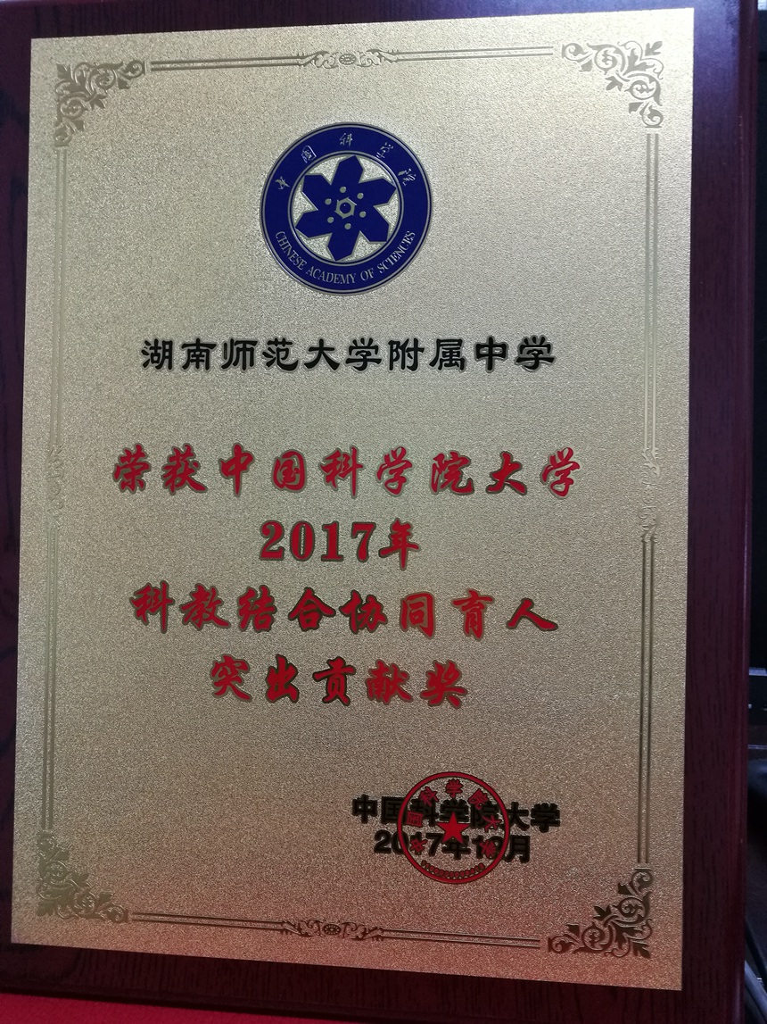 新闻中心 附中新闻 通知公告 最新动态 教育视点 集团学校新闻联播 媒体附中 工作安排 微信附中 我校荣获中国科学院大学2017年科教结合协同育人突出贡献奖 发布:校办公室 来源:课程与教学处 日期:2018-01-15 人气:分享到: 2017年12月8日,中国科学院大学在贵州平塘县天文小镇举办“科教结合协同育人工作研讨会”,我校课程与教学处主任姜小明受邀与会。会上,我校被授予“中国科学院大学2017年科教结合协同育人突出贡献奖”。 中国科学院大学是中国科学技术最高学府,国家教育部正式批准成立的一所以研究生教育为主的科教融合、独具特色的高等学校,隶属于中国科学院。从2014年起开始招收本科生,每年仅招收300多名全国顶尖学生。近几年来,我校每年均有向国科大输送若干名优秀高中毕业生。 (供稿人:姜小明) 上一篇:第40期少年团校结业典礼暨新团员入团仪式隆重举行 下一篇:南京大学授予我校“2017年度最佳生源基地”称号 通知公告 更多 关于征集湖南师大附中“十五五” 湖南师大附中2026年教师招聘(第 湖南师大附中2025年教育教学成果 湖南师范大学附属中学2025年零星 关于举办第40届校园文化艺术节的 湖南师范大学附属中学2026年教师 最新动态 更多