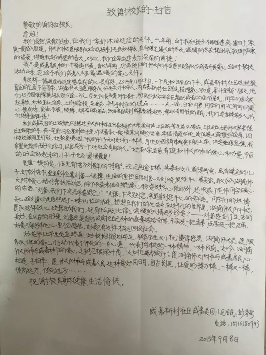 (▲受帮扶家庭给我校志愿者的感谢信)