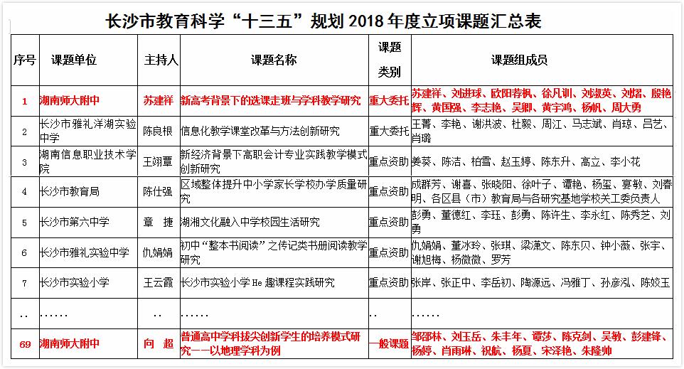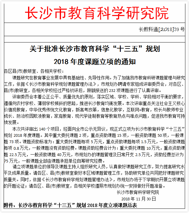 新闻中心 附中新闻 通知公告 最新动态 教育视点 集团学校新闻联播 媒体聚焦 工作安排 微信附中 我校两项课题获准立项为长沙市教育科学“十三五”规划课题 发布:校办公室 来源:科研与教师发展处 日期:2019-01-14 人气:分享到: 2018年底,长沙市教育科学研究院下达了《关于批准长沙市教育科学“十三五”规划2018年度课题立项的通知》(长教科通[2018]39号),校长助理苏建祥主持的课题《新高考背景下的选课走班与学科教学研究》获准立项为重大委托课题(全市仅2项),地理教研组长向超主持的课题《普通高中学科拔尖创新学生的培养模式研究——以地理学科为例》获准立项为一般课题。目前,两项课题都已经作好开题论证的准备工作。 上一篇:湖南师大附中教育集团体艺工作总结交流会在湖南广益实验中学召开 下一篇:谢永红、陈迪勋会见我校精准扶贫对象 通知公告 更多 2025年劳动节放假通知 关于做好政工专业知识考试工作的 2026年多伦多大学士嘉堡校区绿色 2025年清明节放假通知 湖南师范大学附属中学2025年公开 湖南省教育厅关于做好湖南省教育 最新动态 更多