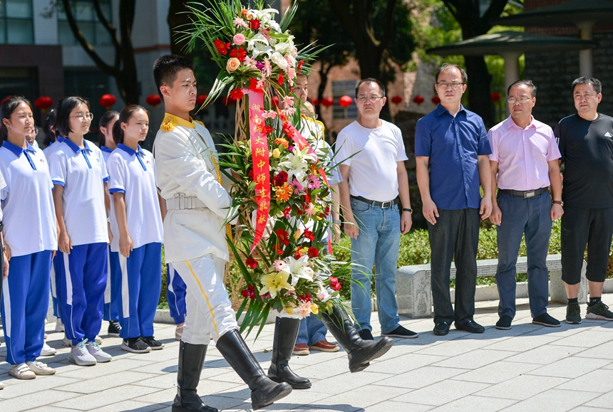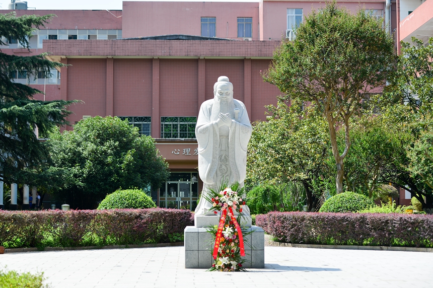 校长助理苏建祥与百余名师生代表站立于孔子雕像前,庄严肃穆。校仪仗队队员手持花篮,正步走向孔子雕像,将花篮敬献在雕像基座前。苏建祥缓步向前,仔细整理花篮缎带。国学社代表王冠博同学颂读祭文,与全体师生共同追忆先贤圣人孔子的生平事迹,表达了对万世师表的怀念与敬意,表明了同学们谨遵先生教诲、勇于创新、敢于拼搏,勇立时代潮头的决心。随后,师生齐诵《论语》,读先贤语录,沐圣贤智慧。诵毕,全体师生整理衣冠,神情肃穆,向孔子雕像三鞠躬。