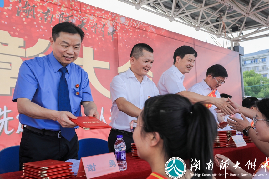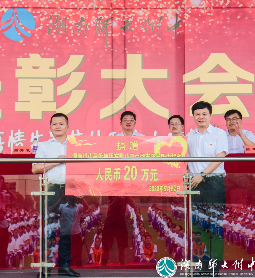 在附中发展的道路上,离不开一批富有社会责任感的企业的大力支持。大会现场,湖南洪山建设集团有限公司向学校捐赠20万元,设立“洪山建设奖”,奖励在抗击新冠肺炎疫情中的优秀教师、优秀教育工作者和优秀学生。谢永红代表学校接受捐赠,并送上捐赠证书。