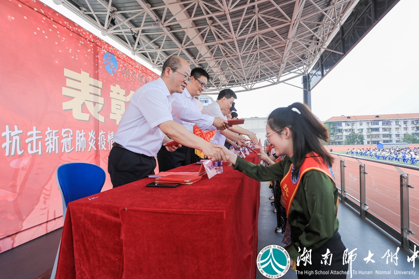 武汉市民自发收集零散的“暖宝宝”送至方舱医院的故事,感动了主席台上发言的优秀校友冯国强,也感动了操场上、看台上数千师生,这位中南大学湘雅二医院国家紧急医学救援队副队长,在武汉抗疫一线奋战多日归来的汉子,说起一线的故事时几度哽咽。从他的分享中,我们近距离的感受到了白衣天使执着无畏的勇敢,也看到了受“公勤仁勇”校训熏陶下的优秀附中人的担当。会上,谢永红校长为他戴上绶带,并授予他湖南师大附中“抗疫先进个人”称号。
