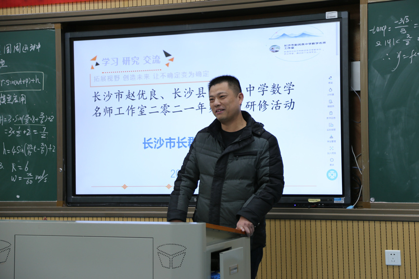 长郡湘府中学杨万维校长发言。杨校长代表学校对赵优良名师工作室成员的到来表示热烈欢迎,他结合自身的专业发展和工作经历谈到对数学教师专业发展的责任与担当,让工作室全体成员倍感温馨。