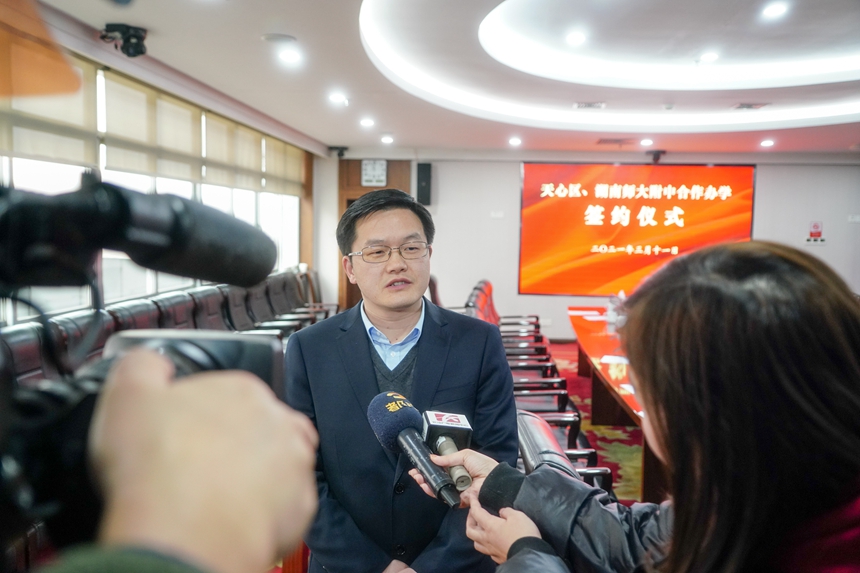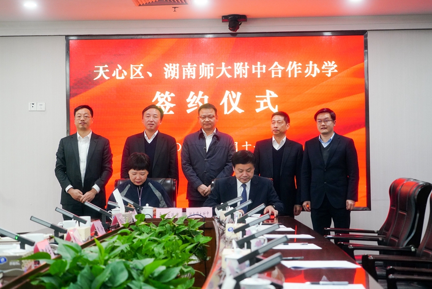 新闻中心 附中新闻 通知公告 最新动态 教育视点 集团学校新闻联播 媒体聚焦 工作安排 微信附中 我校与天心区合作举办湖南师大附中双语实验学校 发布:管理员 来源:校办公室 日期:2021-03-11 人气:分享到: 3月11日上午,我校与天心区人民政府合作举办湖南师大附中双语实验学校签约仪式在天心区区委常委会议室举行。省政府办公厅副主任贺建壬,天心区委副书记、区长黄滔,区委副书记、常务副区长周志军,区政府副区长黄会,区教育局党委书记、局长张伟,我校校长谢永红、党委副书记彭荣宏等领导出席签约仪式。 黄会与谢永红代表双方签订了合作办学协议书。 谢永红作了热情洋溢的讲话,他衷心感谢天心区人民对湖南师大附中的信任和认可,感谢天心区领导对合作办学的大力支持。他表示,附中将认真落实合作办学协议,切实履行自身责任和义务,通过理念输出、文化植入、名师引领、资源共享等方式进行实质性深度合作,努力把双语实验学校办成天心区乃至长沙教育的新名片,为进一步提升天心区基础教育的水平、进一步扩大天心区基础教育的影响、进一步促进天心区基础教育优质均衡发展贡献附中智慧、附中经验和附中力量。 黄滔在讲话中指出,天心区引进优质教育资源湖南师大附中,对于促进区域教育事业发展意义重大,影响深远。希望合作双方紧紧围绕“智慧天心、融城核心”战略部署和“民生造福”目标任务,深化合作、深度融合,努力办好更加公平更有质量的人民满意的天心教育。 贺建壬认为双方合作办学是强强联合,将实现双赢,湖南师大附中是全省乃至全国叫得响的教育品牌,跨江到天心区办学能进一步提高学校品牌影响力,天心区百姓也能在家门口享受省内最优质的教育资源。 彭荣宏在接受采访时表示,合作举办双语实验学校,是附中实施“跨江拓展”发展战略下首次入驻天心区,对附中具有非同寻常的意义,开启了附中教育集团合作办学的新篇章。 仪式结束后,张伟陪同谢永红、彭荣宏一行考察和了解了湖南师大附中双语实验学校建设情况。 据介绍,此次天心区将新建的石人学校与湖南师大附中合作办学,创办湖南师大附中双语实验学校,实现了天心区与省级优质教育品牌的第一次联合办学,为天心教育发展引进了更多先进理念,注入了更强发展动力,提供了更大智力支撑。湖南师大附中双语实验学校为公办九年一贯制学校,学校建成投入使用后由湖南师大附中选派优秀的教学和管理团队负责教育教学管理。学校预计总投资2.95亿元,总建筑面积约5万余平方米,建设包括教学楼、综合楼、科技楼、体艺馆、知行楼、运动场等。预计办学规模54个班。其中,小学部36个班,初中部18个班。可容纳3000左右学生入学。 (撰稿:苏晓玲 审稿:彭荣宏) 上一篇:三月春风拂面,雷锋精神永传——我校师生到学堂坡社区开展志愿服务活动 下一篇:长沙市教育局来校督导2021年春季开学工作 通知公告 更多 湖南师范大学附属中学2024年度废 湖南师范大学附属中学化学实验室 湖南师范大学附属中学出国(境) 关于开展2024年暑假教科研论文评 湖南师范大学附属中学2024年暑假 关于申报“十四五”课题2024年度 最新动态 更多