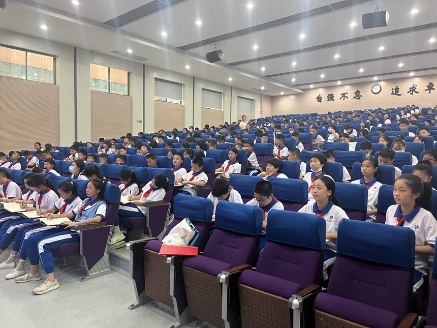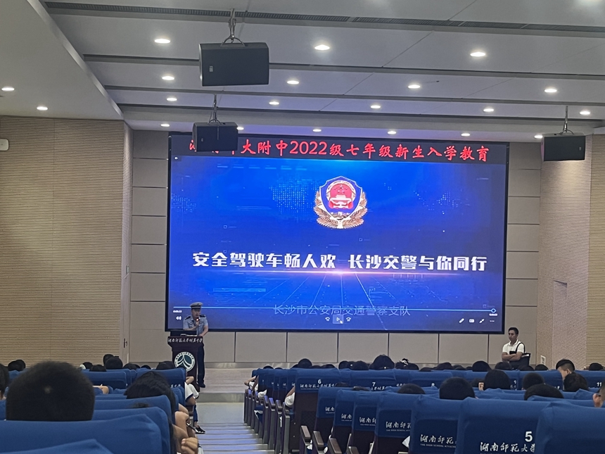 七年级学生在会议厅集中学习。课程与教学处副主任朱修龙介绍了附中的课程安排和特色,并提醒学生们上课时需要注意的事项。心理老师李浩通过有趣的游戏互动让同学们了解到初中新生活可能会遇到的问题和挑战,以便更好适应初中生活。附中校医宁静给大家带来了校园常见传染病的“防控攻略”,强调健康的重要性。图书馆管理员鲁芬芬、潘媛媛介绍了图书馆的借阅规则,并讲解了阅览室的使用方法。岳麓区交警四中队警官陈旨良上了一节重要的交通安全课,警醒大家注意交通安全。年级主任及各备课组长带来了宝贵的学法指导,鼓励七年级的学生要做德才兼备、珍爱生命、心系国家的优秀附中人。