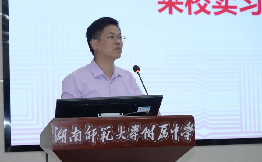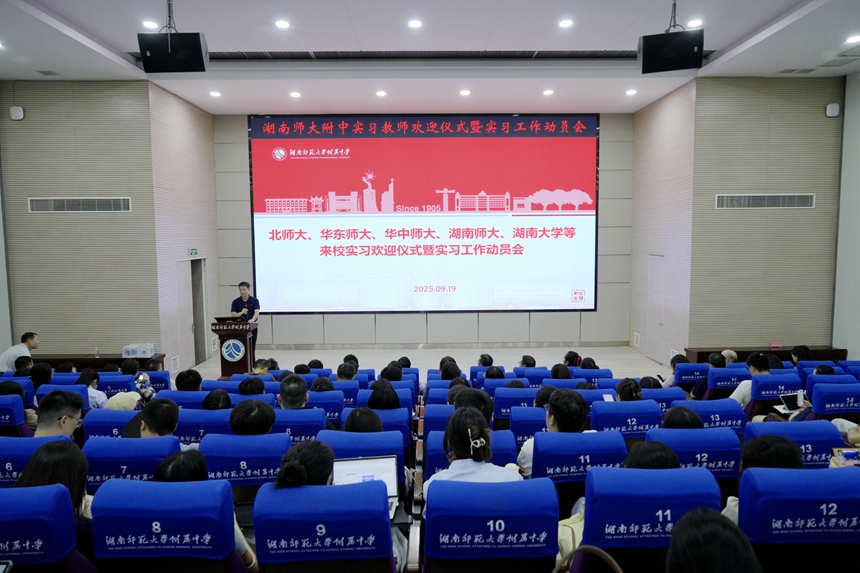 9月19日下午,我校在道德讲堂召开2025年来校实习生欢迎仪式暨实习工作动员大会。来自北京师范大学、华东师范大学、华中师范大学、湖南师范大学及湖南大学等多所高校的实习生,与高校领导、带队老师,以及我校相关部门领导、指导教师齐聚一堂,共同开启为期三个月的实习之旅。湖南师范大学历史文化学院院长刘利民,我校副校长苏建祥、廖强出席本次会议。