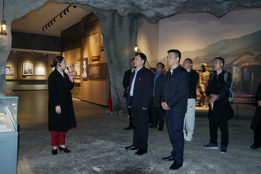 党员们观看了沉浸式红色展演,演出通过艺术形式再现水口山工人从受压迫到奋起抗争的革命历程。随后参观了《水口山工人运动历史陈列》《耿飚生平业绩陈列》和《水口山矿冶史陈列》三大展区,深入了解 1922 年工人大罢工事迹、耿飚同志革命生涯及千年矿冶历史。