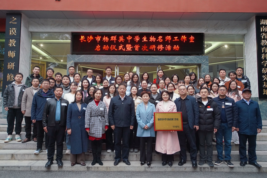新闻中心 附中新闻 通知公告 最新动态 教育视点 集团学校新闻联播 媒体附中 工作安排 微信附中 长沙市杨群英中学生物名师工作室启动仪式暨首次研修活动在我校举行 发布:管理员 来源:未知 日期:2025-12-05 人气:分享到: 2月4日,长沙市杨群英中学生物名师工作室启动仪式暨首次研修活动于我校顺利举办。长沙市教育局党委副书记、副局长邓芸、教师工作处处长李峰,我校校长苏建祥等领导到场,工作室全体成员参与活动。 苏建祥致欢迎辞,他承诺我校将从多方面为工作室提供保障,期待其成为全市生物教师专业成长重要平台;邓芸副局长肯定工作室往届成效并提出新要求,明确教育局将给予政策与经费支持,希望其成为生物教育 “智囊团” 与 “孵化器”;李峰处长宣读工作室成立及聘任文件,与会领导共同为工作室揭牌并为顾问、名师团队颁发聘书。杨群英作为首席名师作履职表态,学员代表吴俊文也表达了学习成长的决心。启动仪式由我校副校长陈胸怀主持。 首次研修阶段,杨群英梳理往届成果并阐述新周期工作规划,工作室顾问曾峰作《如何做研究型教师》专题报告,活动还为上届优秀成员颁发结业证书。仪式后,全体人员合影并开展小组破冰活动,凝聚团队合力。 此次活动标志着工作室新征程开启,未来其将在市教育局指导与我校支持下,助力打造高素质生物教师队伍,为提升长沙中学生物教育教学水平赋能。 上一篇:我校八年级师生赴张家界民族中学开展助学实践活动 下一篇:我校召开2025-2026学年度第一学期教育教学半期工作总结会议 通知公告 更多 关于征集湖南师大附中“十五五” 湖南师大附中2026年教师招聘(第 关于开展2024-2025学年度科研成果评 湖南师大附中2026年教师招聘(第 湖南师大附中2025年教育教学成果 湖南师范大学附属中学2025年零星 最新动态 更多