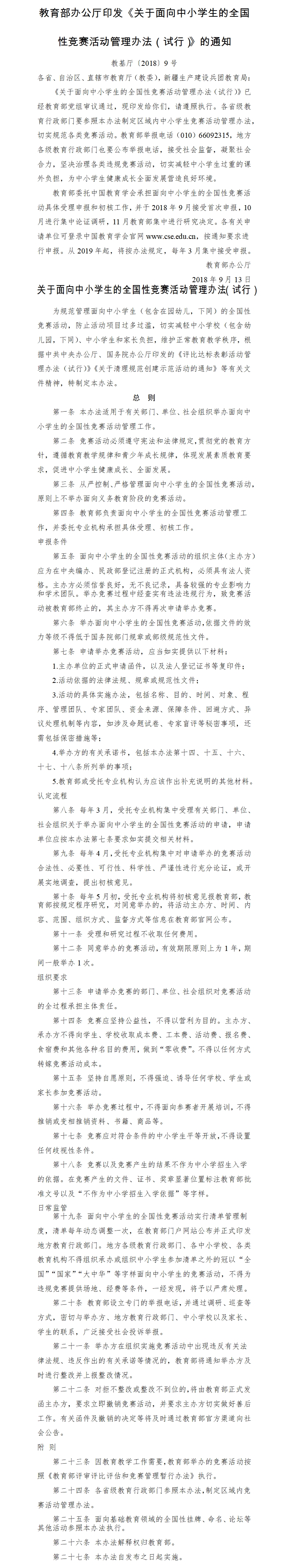 新闻中心 附中新闻 通知公告 最新动态 教育视点 集团学校新闻联播 媒体聚焦 工作安排 微信附中 教育部办公厅印发《关于面向中小学生的全国性竞赛活动管理办法(试行)》的通知 发布:系统管理员 来源:未知 日期:2018-09-25 人气:分享到: 上一篇:长沙市中小学教师师德师风建设行动计划(2018-2020年) 下一篇:国务院办公厅关于规范校外培训机构发展的意见 通知公告 更多 2024年端午节放假通知 湖南师范大学附属中学2024年寒假 关于湖南师范大学开展“师大好网 湖南师大附中2024年端午节教职工 湖南师大附中2023-2024学年度考核工 湖南师大附中2024年公开招聘专任 最新动态 更多