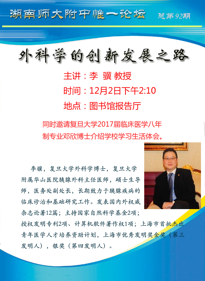 新闻中心 附中新闻 通知公告 最新动态 教育视点 集团学校新闻联播 媒体聚焦 工作安排 微信附中 惟一论坛第92期:外科学的创新发展之路 发布:课程与教学处 来源:未知 日期:2017-11-27 人气:分享到: 上一篇:湖南师大附中教育集团第三届第一次青年教师教学竞赛活动方案 下一篇:惟一论坛第93期:改变未来的智能材料 通知公告 更多 湖南师范大学附属中学食堂物资供 湖南师范大学附属中学2024年门面 2024年湖南师大附中桐梓实验中学 湖南师范大学附属中学2024年公开 湖南师范大学附属中学化学实验室 湖南师范大学附属中学2024级七年 最新动态 更多