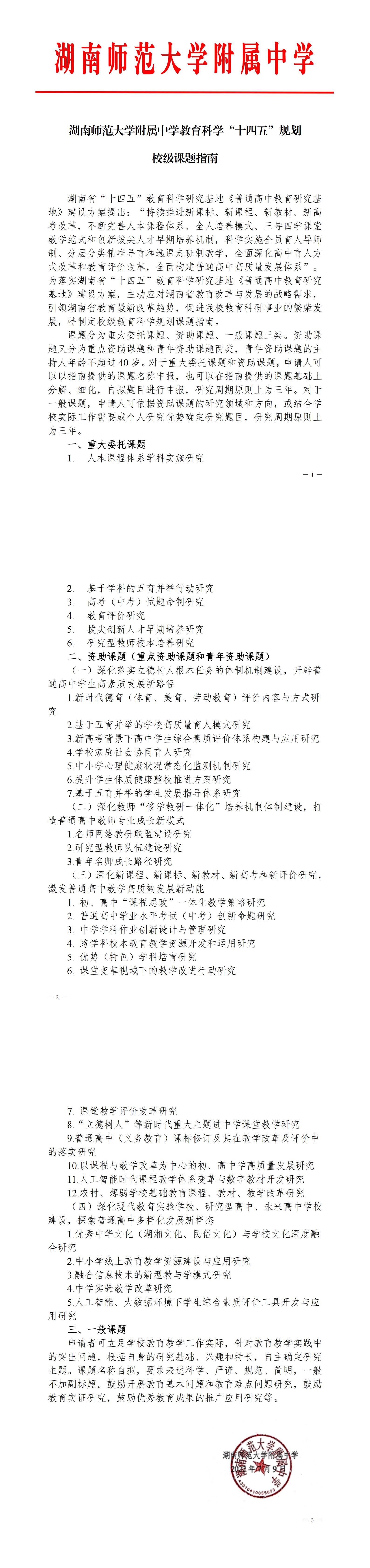 新闻中心 附中新闻 通知公告 最新动态 教育视点 集团学校新闻联播 媒体附中 工作安排 微信附中 湖南师范大学附属中学教育科学“十四五”规划校级课题指南 发布:系统管理员 来源:未知 日期:2022-07-09 人气:分享到: 上一篇:湖南师大附中云麓楼卫生间改造工程竞争性磋商邀请公告 下一篇:湖南师大附中艺术楼楼道装饰设计及安装工程询价公告 通知公告 更多 关于征集湖南师大附中“十五五” 湖南师大附中2026年教师招聘(第 湖南师大附中2025年教育教学成果 湖南师范大学附属中学2025年零星 关于举办第40届校园文化艺术节的 湖南师范大学附属中学2026年教师 最新动态 更多