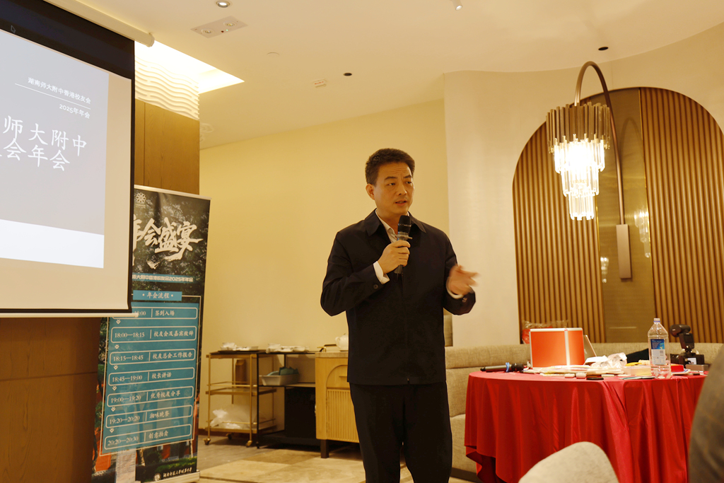 校友总会秘书长谭伟发言,她详细回顾了学校120周年校庆的高光时刻、2025年湖南省委省政府“校友回湘”工作的推进成效以及学校2025年的重要发展成果。她特别指出,香港校友会在母校百廿校庆期间贡献突出,不仅捐款10万元赞助“校庆大课间”活动服装,更协助杰出校友李立三的后人捐赠《九月来信》影印版、天安门城楼照片等珍贵历史文物,为校庆活动的圆满举办增光添彩。在“校友回湘”工作中,香港校友会积极响应湖南省委省政府号召,主动参与校友寄语视频录制等活动,为“校友回湘”工作宣传造势,得到省委“校友回湘”工作专班的高度认可,为各地校友会树立了榜样。