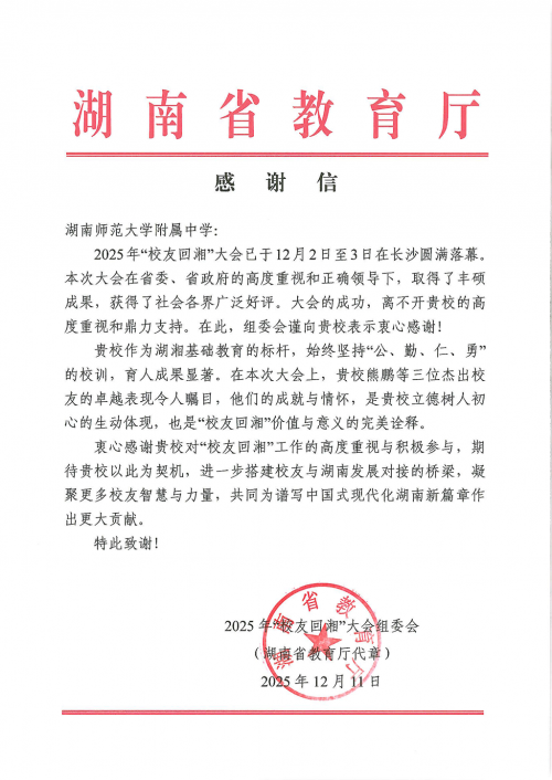 年会上,校友代表们的分享真挚动人。湖南师大附中校友、国家电网海外投资公司总经理欧晓明深情追忆了在岳麓山下的青春岁月,鼓励在场校友牢记母校培育与校领导的殷切期望,传承附中人“自强不息 追求卓越”的精神底色,在各自领域为国家发展和社会进步贡献力量。