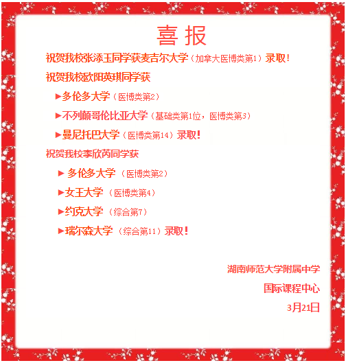 湖南师大附中国际课程中心的学生,通过三年AP、A-level两大课程体系的学习,已向美国、英国、加拿大、澳大利亚、新加坡、香港等国家和地区的知名大学提交了申请。近期,在学生、家长及老师们的期盼中,我校40名同学陆续收到来自世界各国知名大学的录取通知113份,更多喜讯将持续更新。