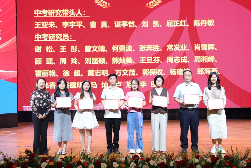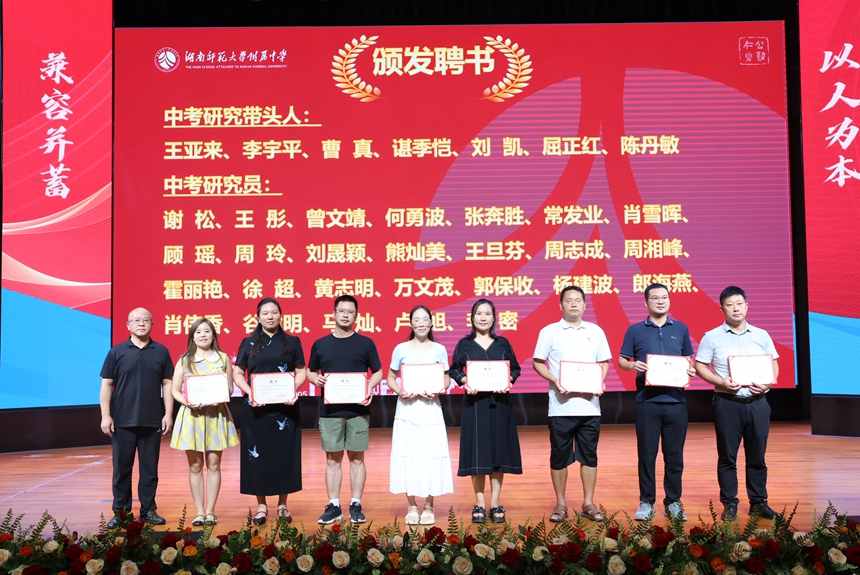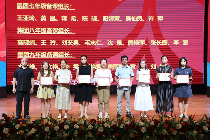 附中双语实验学校书记陈益表示,教育是关乎生命成长的事业,呼吁共建“有爱、有趣、有生命力”的教育生态。集团办副主任李海汾作年度教学质量分析报告,总结成绩、分析问题。博才实验中学欧阳根根老师就年级管理工作作经验交流。课程与教学处主任陈淼君宣读并颁发了新学年集团大备课组组长及中考研究带头人聘书。陈胸怀提出“双轮驱动、四条路径、三个思考”,强调质量提升与创新培养并重。各集团校就教学计划落实、考试研究、活动协作等议题展开深入交流,达成多项共识。