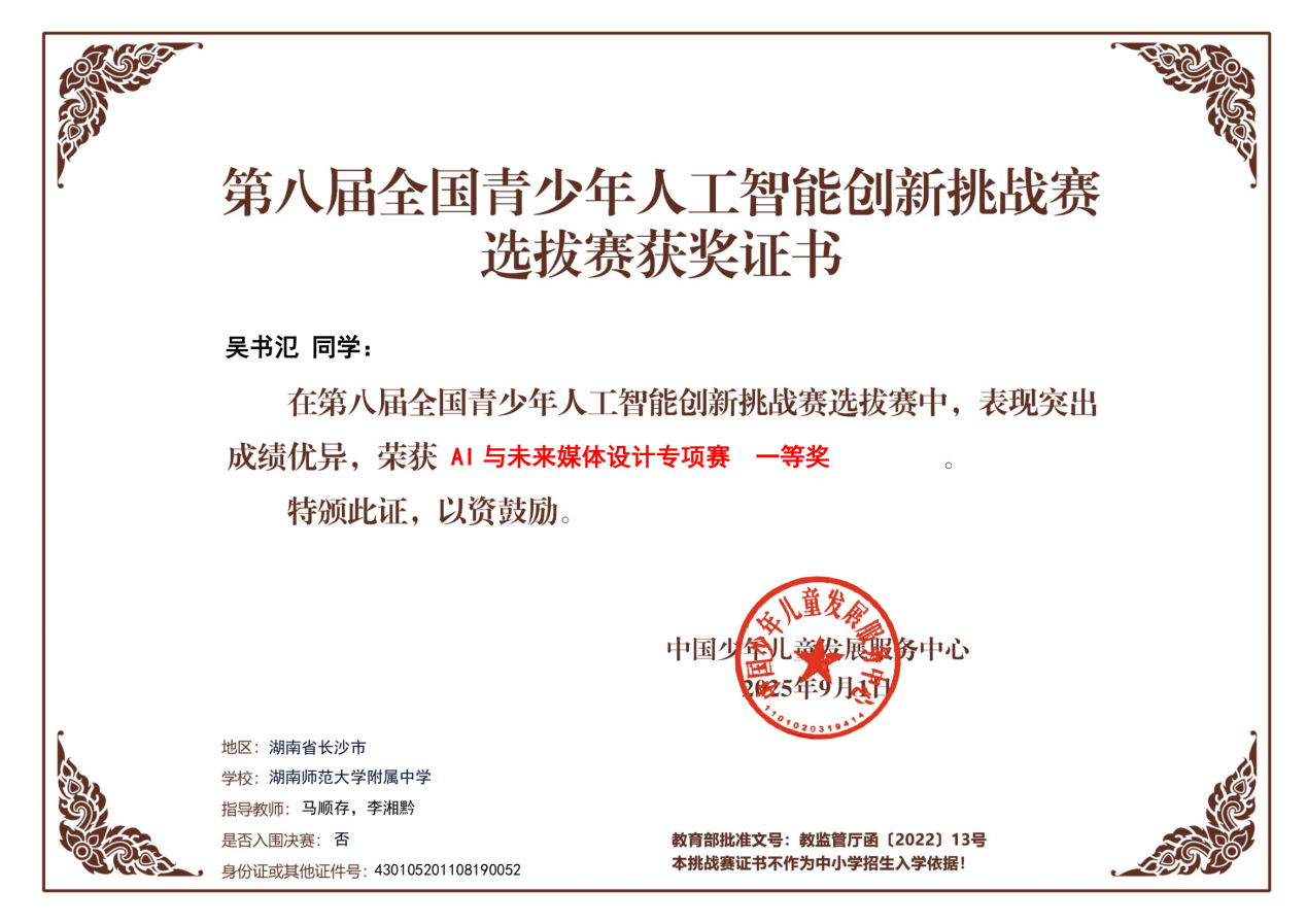 备受瞩目的第八届全国青少年人工智能创新挑战赛,经过激烈角逐后,湖南师大附中两名初二学生吴书氾、吴书汀在第八届全国青少年人工智能创新挑战赛中,分获省赛一等奖和二等奖,湖南师大附中采用STEM教育为莘莘学子搭建起通往梦想的阶梯。