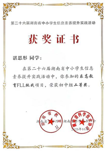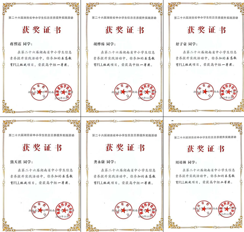 近日,第二十六届湖南省中小学生信息素养提升实践活动结果揭晓。我校机器人竞赛团队选派的10名学生全部获奖,获省级一等奖5人、二等奖5人,学校获评“优秀组织奖”。