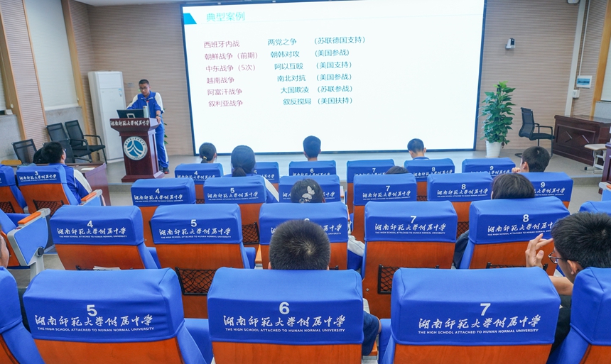李畅分析了俄乌战争,以此来引出主题,详细阐述了代理人战争的概念。用一系列的提问引导同学们深入了解了战争背后的种种因素,指出由大国在背后支持的“代理人战争”已经成为了自二战以来国际冲突的主要形式,并带领同学们总结了“代理人战争”的几大特点和主要影响。李畅同学呼吁,时代给予的挑战终将由年轻一代来承担。作为附中的一份子,同学们理应发愤图强,自强不息,为迎接新时代对我们的考验做好充分准备。