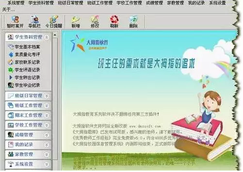一套专为中小学班主任设计的免费软件。软件能统计分析学生考试成绩,打印学生登分名册,记载学生考勤情况,点写学生评语,打印学生通知书。