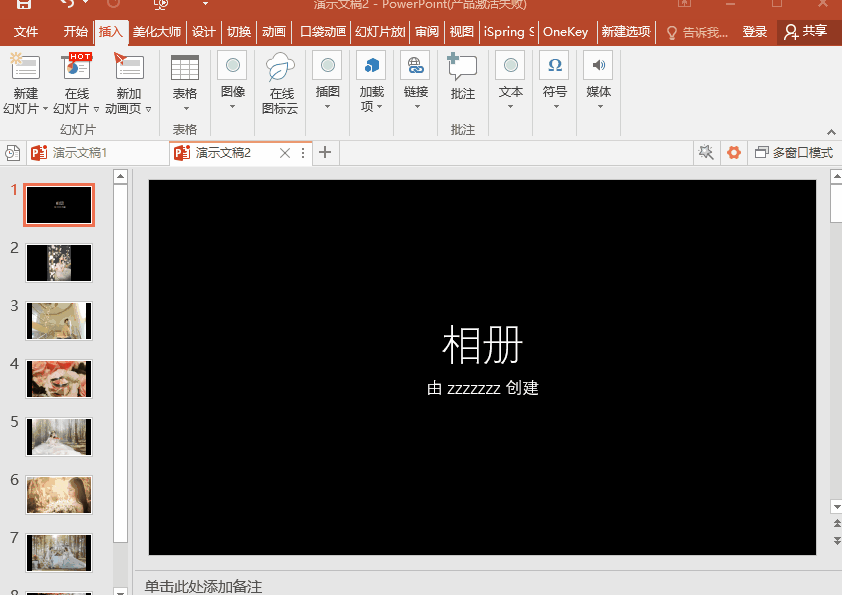 那如果要批量导入图片呢?那也很简单,我们点击【插入】——【相册】——【文件/磁盘】,在这里面将图片都添加进来即可,这样就可以将每一张图片分别插入到每一页PPT里了~