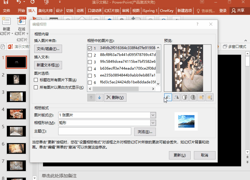 点击工具栏的【相册】——【编辑相册】功能,在【图片版式】中我们可以对图片进行显示设置,例如我们想要一张PPT里显示两张图片,那么我们就可以在这里面选择【2张图片】。