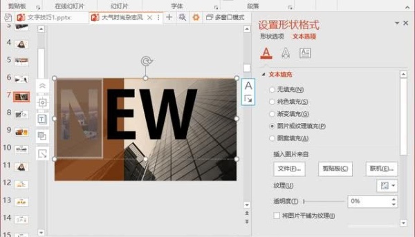 有时候觉得文字太过单调,我们还可以用图片来填充文字,选中文字,右键点击设置【文字效果格式】——【填充】——【图片或纹理填充】: