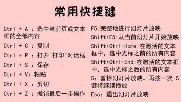 上面小编只列举了几个例子,在这里小编给大家整理一个常用快捷键,熟记它们你会发现你制作PPT的效率倍增!