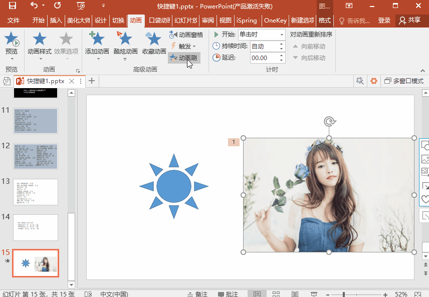 最后还有一个很好用的动画刷!我们有时给一个图形设置了超级复杂的动画,然后需要在另一个图形上也设置同样的动画的时候,动画刷就超级好用了!只要点击动画刷再点一下图形,多复杂的动画都可以一秒复制!