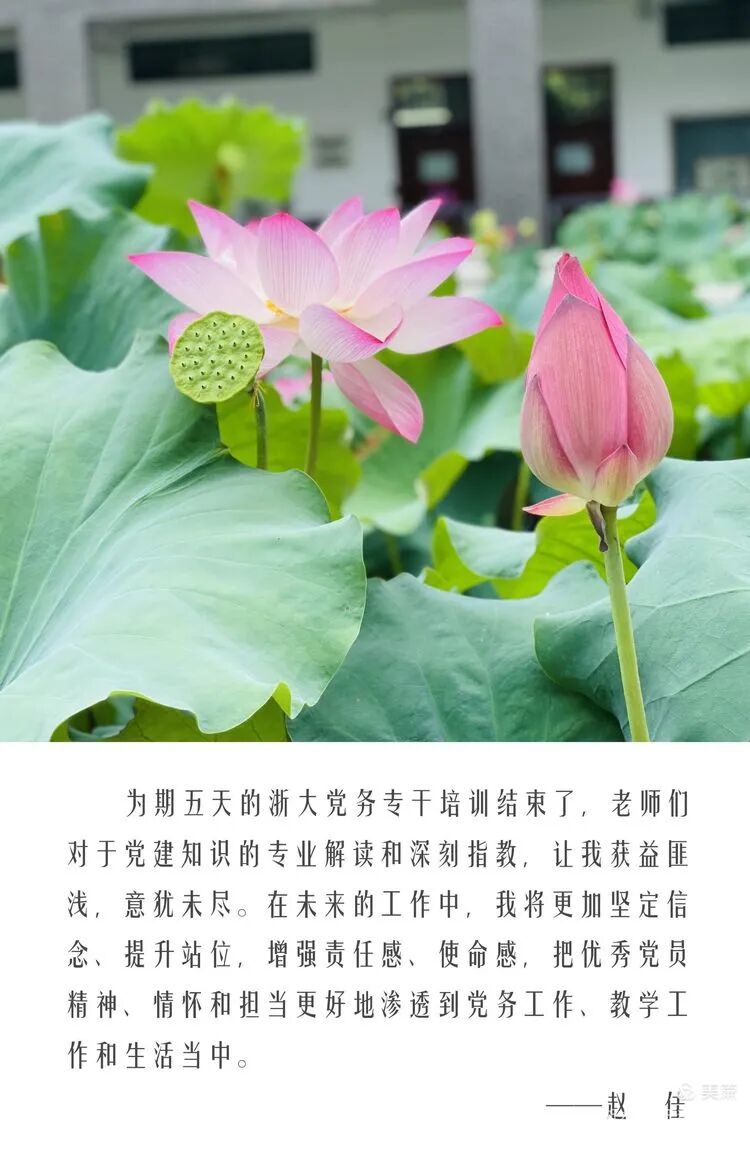北有未名湖,南有华家池。非常有幸能有机会来到浙江大学华家池校区参与这次弥足珍贵的七日党务培训求学之旅。不论是精彩纷呈的课堂讲学,还是置身其中的现场教学,都让我们深受触动,受益匪浅:为革命志士们心怀理想信念、抛头颅洒热血的牺牲精神而热泪盈眶;为习近平总书记“我将无我,不负人民”的为民情怀而心潮澎湃;为身边的布尔什维克——远赴他乡投身华人教育事业的支教教师而由衷敬佩;为胸怀理想抱负家国情怀,身在学校、神在课堂、心在学生的人民教师而振奋不已。