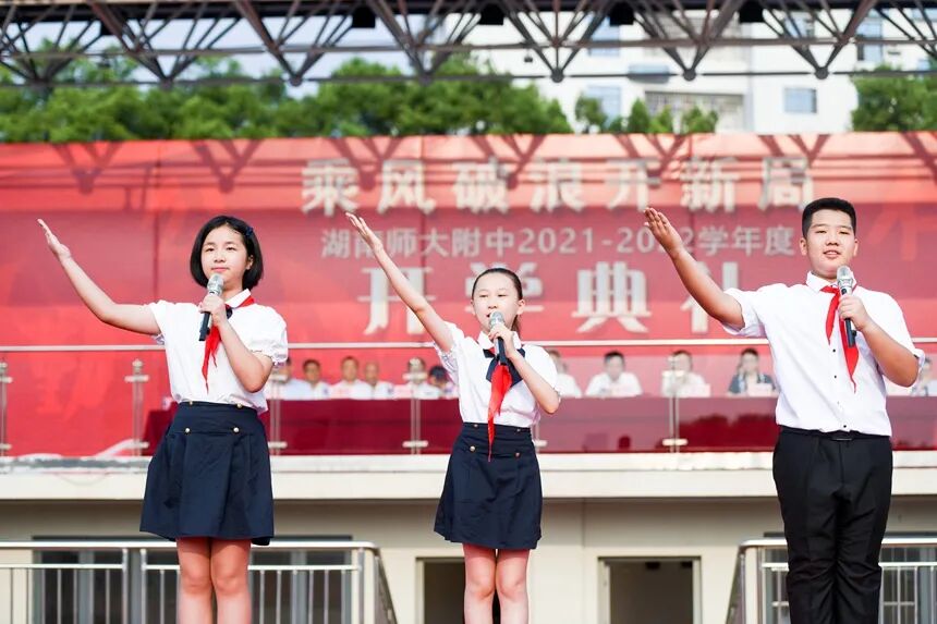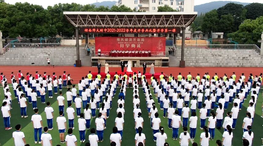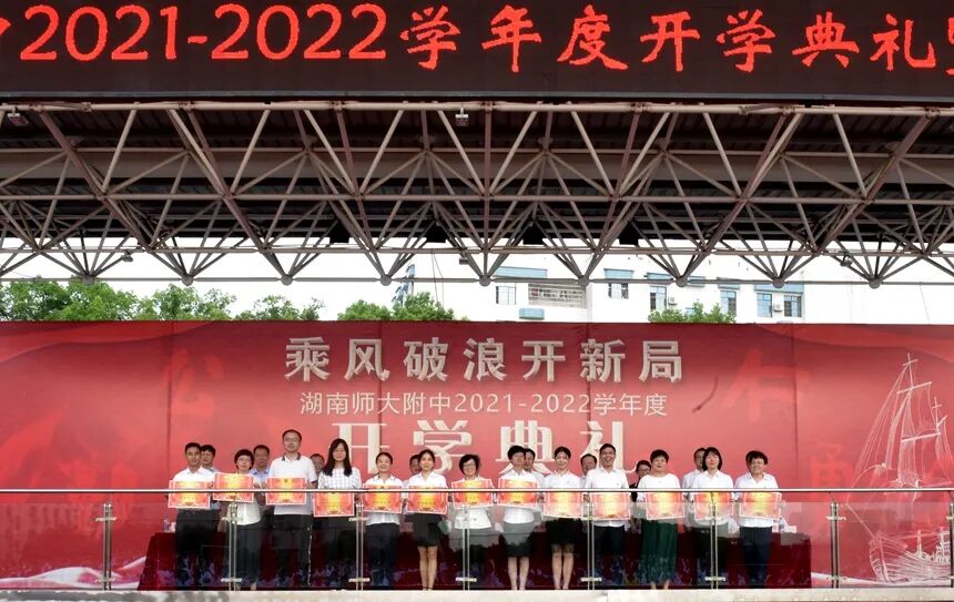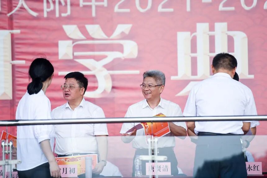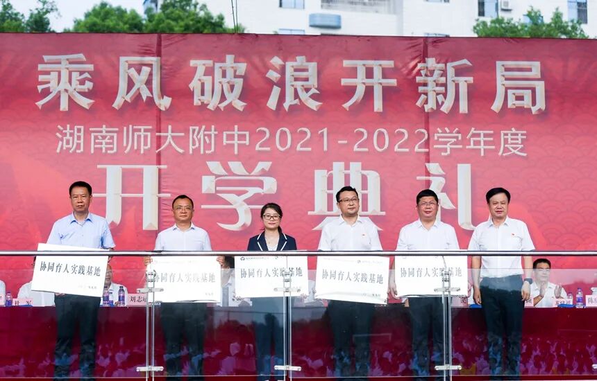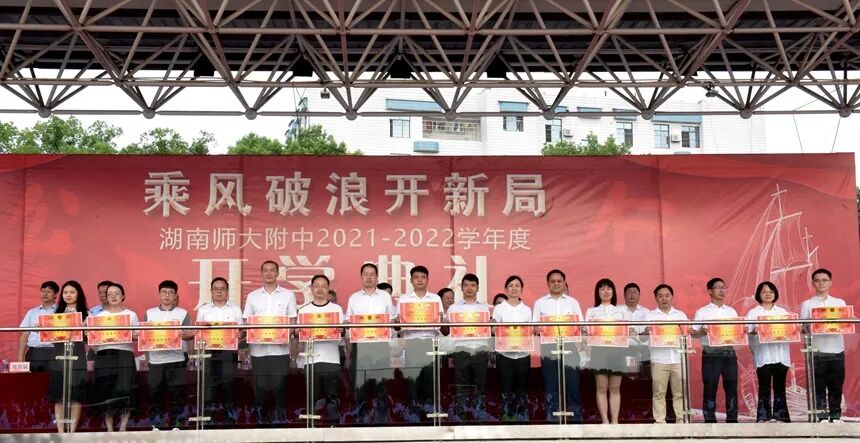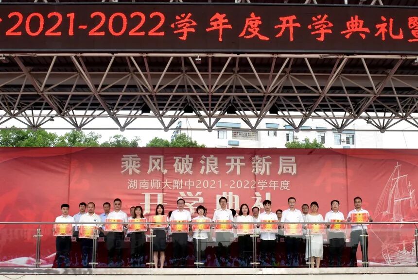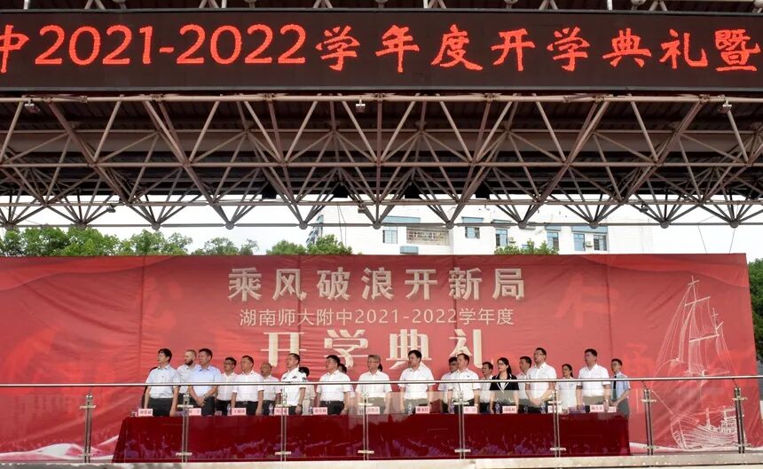 来自湖南师范大学的副校长唐贤清、基础教育发展中心主任龚民;来自学校“协同育人实践基地”的嘉宾楚天科技股份有限公司副总裁周婧颖、湖南达嘉维康医药有限公司董事长王毅清、中国铁路广州局集团有限公司长沙南站副站长陈庚荣、中联重科股份有限公司行政部部长周宇、中南大学湘雅三医院党委副书记杨飞龙;我校校长谢永红,党委书记黄月初,法治副校长、岳麓区公安分局政委刘志敏,党委副书记彭荣宏,副校长兼工会主席陈迪勋,纪检书记李春莲,副校长苏建祥,挂职副校长杜军,国家万人计划教学名师肖鹏飞,学术委员会主任何宗罗,教学指导委员会主任汪训贤,教师委员会主任杨群英,外籍教师JACK,家长委员会副主任刘常斌,新生家长代表牛轶峰,优秀毕业生代表中国人民大学2021级新生刘鸿睿,校学生会主席田雅在主席台就坐。团委书记兼德育与学生发展处副主任李钊主持仪式。