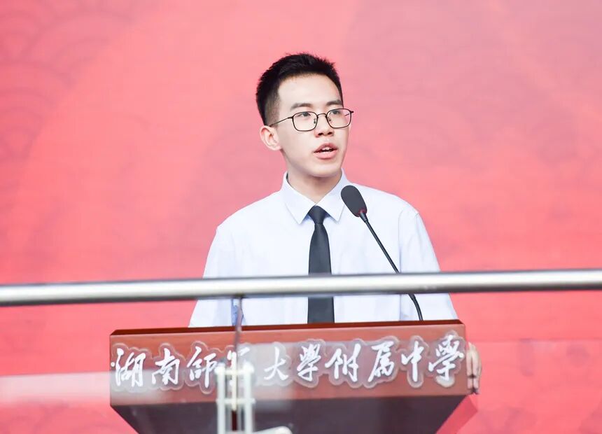 优秀毕业生代表1825班刘鸿睿与学弟学妹们分享了文化学习与素质拓展的成长心得,他勉励学弟学妹们要善于在保证学习质量的前提下,积极抓住提升自我、磨练能力的机会,真正成长为一名“拎得清、拿得起、放得下”的附中学子。