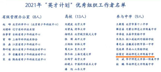 近日,从全国英才计划管理办公室和中国科协青少年科技中心传来喜讯:我校成功入选中科协“全国英才计划中学培养基地学校”,湖南省唯一!在全国“英才计划”2021年工作总结会议中,我校被评为2021年全国“英才计划”优秀组织实施单位,党委副书记彭荣宏被评为全国“英才计划”优秀组织工作者。