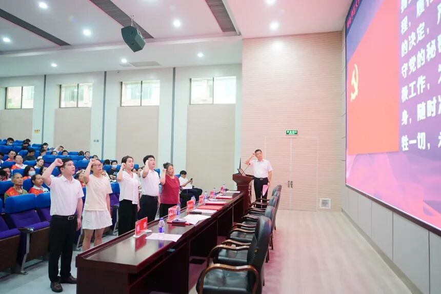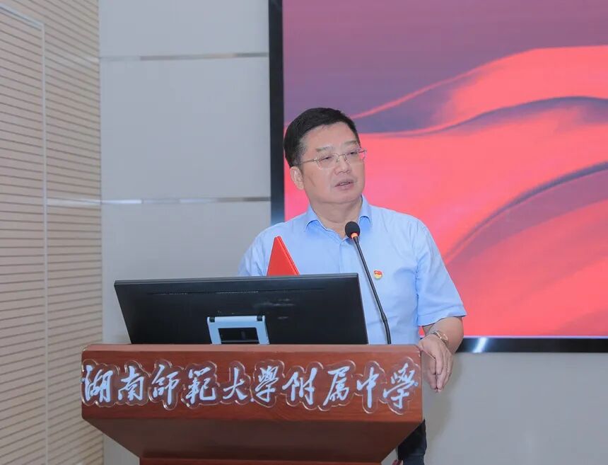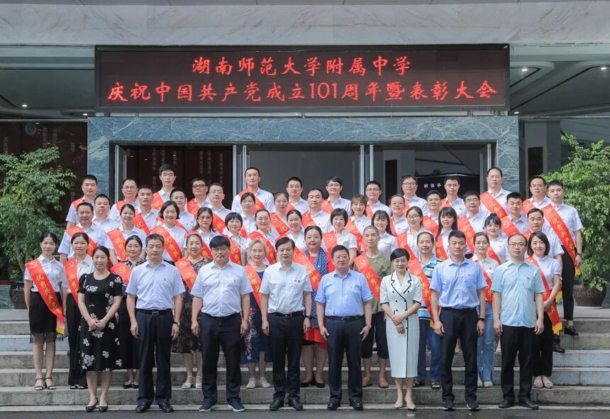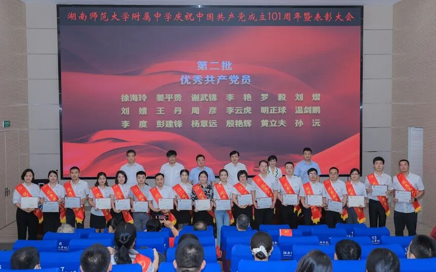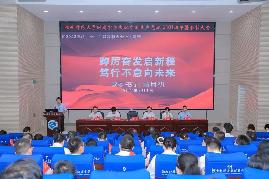 为庆祝中国共产党成立101周年,喜迎党的二十大胜利召开,大力弘扬伟大建党精神,7月1日,湖南师大附中举行庆祝建党101周年暨表彰大会。全体在家党委领导在主席台就座,本部全体在职党员、广益总支与离退休总支负责同志和获奖代表、2021—2022学年度新发展党员参加会议。
