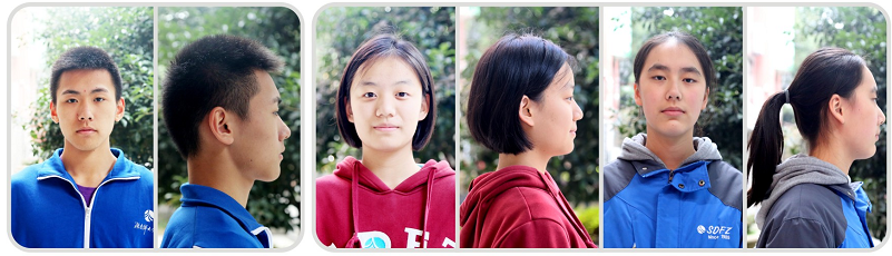 (2)男生推荐发型为短发,做到不留长发,不剃光头,不理碎发,不留怪异发型;女生推荐发型为运动短发或马尾辫,做到前额刘海不遮眉、侧面鬓角不过腮、后面头发不过肩,不烫发染发,不留超短发,不披头散发或不留怪异发型。