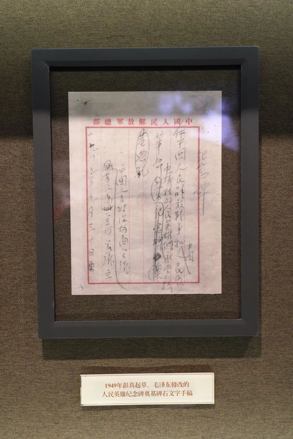 9月28日,北京市档案馆基本陈列展《档案见证北京》展出的1949年彭真起草、毛泽东修改的人民英雄纪念碑奠基碑石文字手稿。新华每日电讯记者马晓冬摄83岁的北京市民陈光铭回忆,1949年9月23日上午全国政协工作人员突然找上门来,邀请父亲陈志敬制作奠基碑。父亲知道任务重大,当场保证“全力完成”。“为了做好奠基碑,我们全家一起上阵打磨清洗石料,大伯和父亲更是点灯熬夜轮流制作。正常需要20天的工期,我们6天就完成了任务。”从党和国家领导人到当时中国最顶尖的建筑师、艺术家、文史专家、民间艺人、建筑工人,广泛发表意见,反复酝酿、修改建造方案。