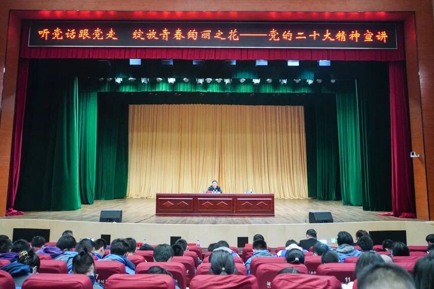 2022年11月29日下午,湖南省委宣讲团成员、共青团湖南省委书记李志超来我校宣讲党的二十大精神。共青团长沙市委书记刘林志、全体在家校领导参加宣讲活动。李志超从党的二十大主题、取得的一系列重大成果带领大家深刻认识了党的二十大的重大意义。他结合青年的现实体验和直观感受,把党的二十大精神讲鲜活,对党的二十大精神积极作出“青年化”阐释,引导青年树立对马克思主义的信仰、对中国特色社会主义的信念、对中华民族伟大复兴中国梦的信心,号召大家把自己的小我融入祖国的大我、人民的大我之中,绽放青春绚丽之花。