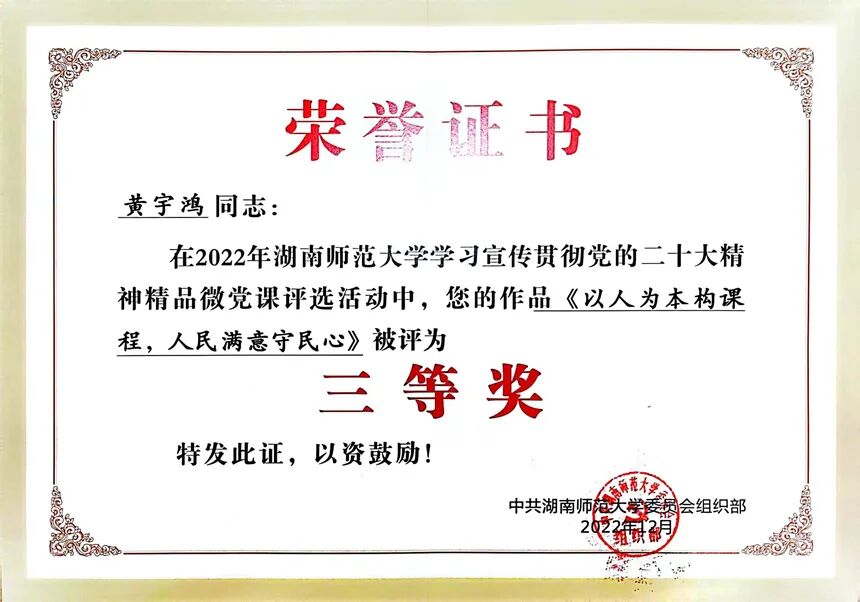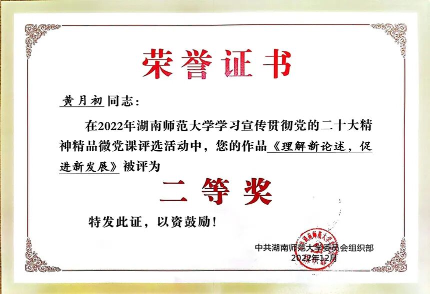 近日,湖南师范大学公布学习宣传贯彻党的二十大精神精品微党课获奖名单。我校党委书记黄月初微党课《理解新论述,促进新发展》荣获二等奖,党委委员黄宇鸿微党课《以人为本构课程,人民满意守民心》荣获三等奖。我校微党课聚焦“学习宣传贯彻党的二十大精神”主题,联系实际工作,以小的切口深刻阐述蕴含其中的思想观点和精神实质。同时,我校以此次活动为契机,积极探索党员学习教育的新方式,广泛发挥微型党课以小见大、见微知著的优势,以赛促学、以学促行,推动党的创新理论入耳入脑入心入行。