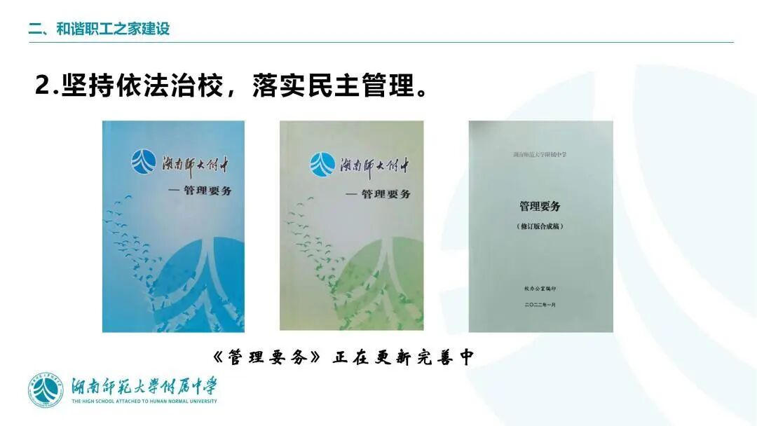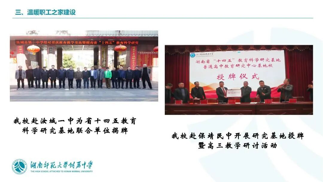 湖南师范大学附属中学工会始终秉持职工之家是学校党政工精心营造的温馨之家、民主之家、文明之家的理念,通过开展建设“职工之家”活动,民主政治建设逐步规范,办学规模不断扩大,教学质量节节攀升。在全校教职工共同努力下,学校已成为了湖南基础教育的领头羊、现代实验学校的标杆。今后,我们将继续贯彻落实习近平总书记关于工人阶级和工会工作的重要论述,推进我校职工之家建设,团结和组织广大会员,与时俱进,奋发进取,努力开创我校建家工作的新局面,为争创全国“五一”劳动奖状,打造健康附中,幸福附中,为学校改革和发展做出更大的贡献。
