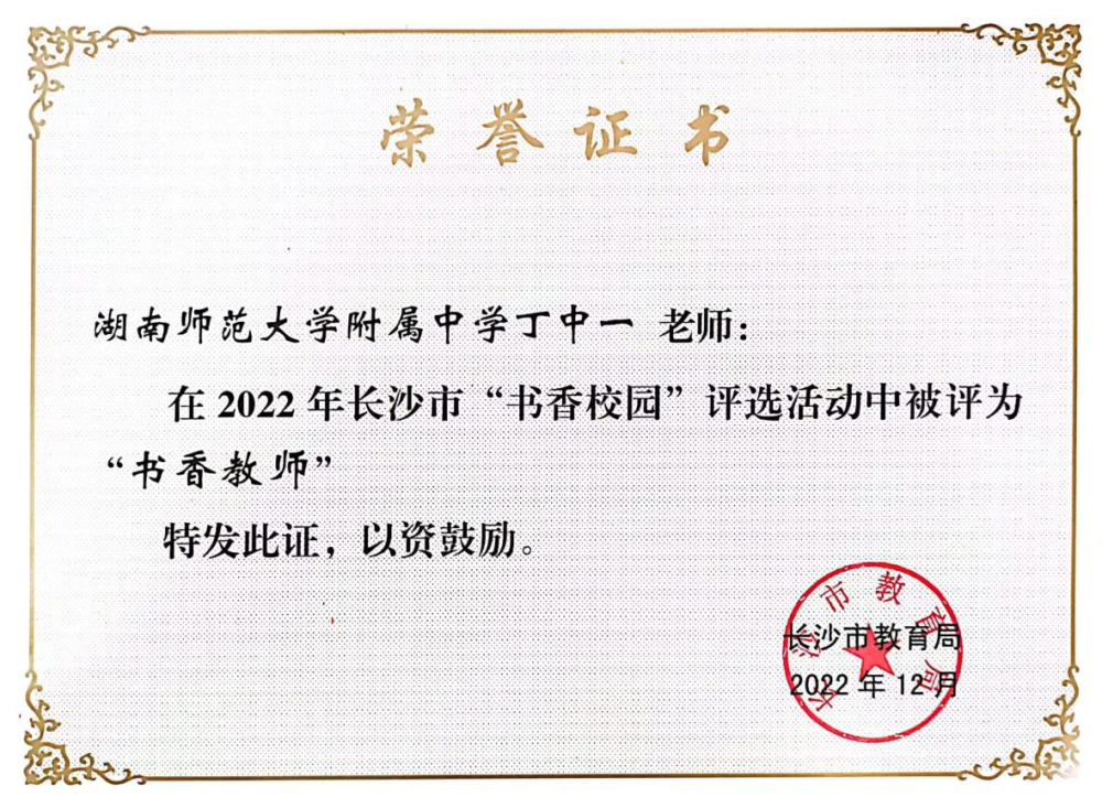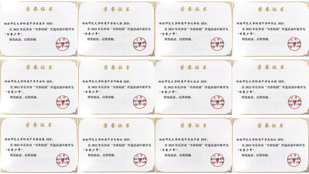 2022年12月,长沙市教育局公布了优秀“书香校园”系列活动评选结果,我校喜获多个奖项。学校荣获“长沙市优秀书香学校”荣誉,丁中一老师被评为“长沙市书香教师”,刘希桢、黄健粟、陈之谦、罗诗雨、卿熙容、邓潍谦、温乐祺、廖浩宇、肖旖涵、聂瑞冰、汪乐涵、苏子晴等十二位同学荣获“长沙市书香少年”称号。