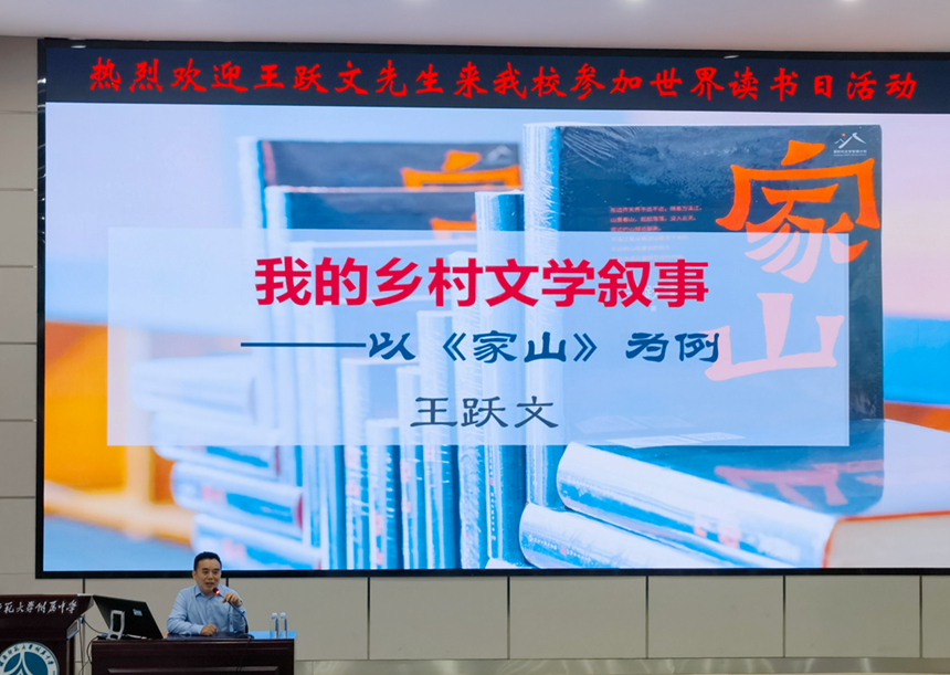 4月20日下午,学校举行世界读书日系列活动启动仪式,校长谢永红出席。中国作家协会主席团委员、原湖南省作协主席王跃文先生做“我的乡村文学叙事——以《家山》为例”文学讲座,科研与教师发展处主任刘进球、图书馆馆长童建庭、语文组教师代表、高一年级历史类班级的两百余名学生在现场参与活动。活动由语文教研组副组长李显亮主持。