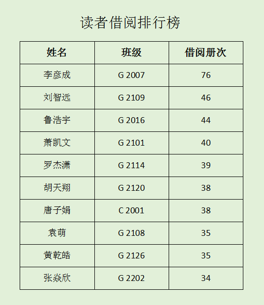 师生借阅图书(含通过图书漂流柜自动借阅)热情高涨。高2007班李彦成同学全学年借阅图书76册次,位列本学年借阅榜榜首。下述10位同学借阅量名列前茅,是本学年度当之无愧的阅读之星。