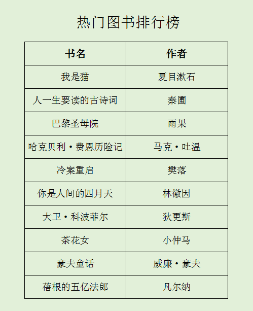 这一学年,夏目漱石的《我是猫》仍然高居榜首,看来今年的新生们也格外喜欢这本轻快洒脱、富于机智的世界名著。《热门图书排行榜》显示:附中学子对于我国传统诗词文化及外国文学名著较为喜爱。