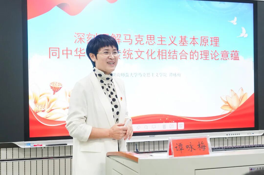 随后,开展新教材教学研讨专题讲座、“传统文化”主题微课展示、同课异构等一系列研讨交流活动。湖南师大附中政治教研组组长蒋平波、政治教师屈正红分别进行专题讲座。