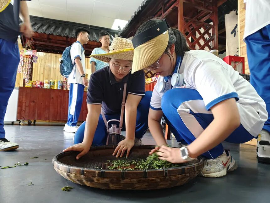 在衡阳常宁县茶艺师傅的指导下,学生们学习如何识别茶叶的嫩度、采摘技巧以及如何手工炒制茶叶。他们小心翼翼地用指尖掐下最嫩的茶芽,感受着茶叶在手中轻轻滑过的细腻触感。炒茶时,锅中的温度与茶叶的翻炒节奏,都考验着学生们的耐心与细心。茶香四溢,学生们在体验中不仅学习了茶艺知识,更体会到了中国传统文化的博大精深。