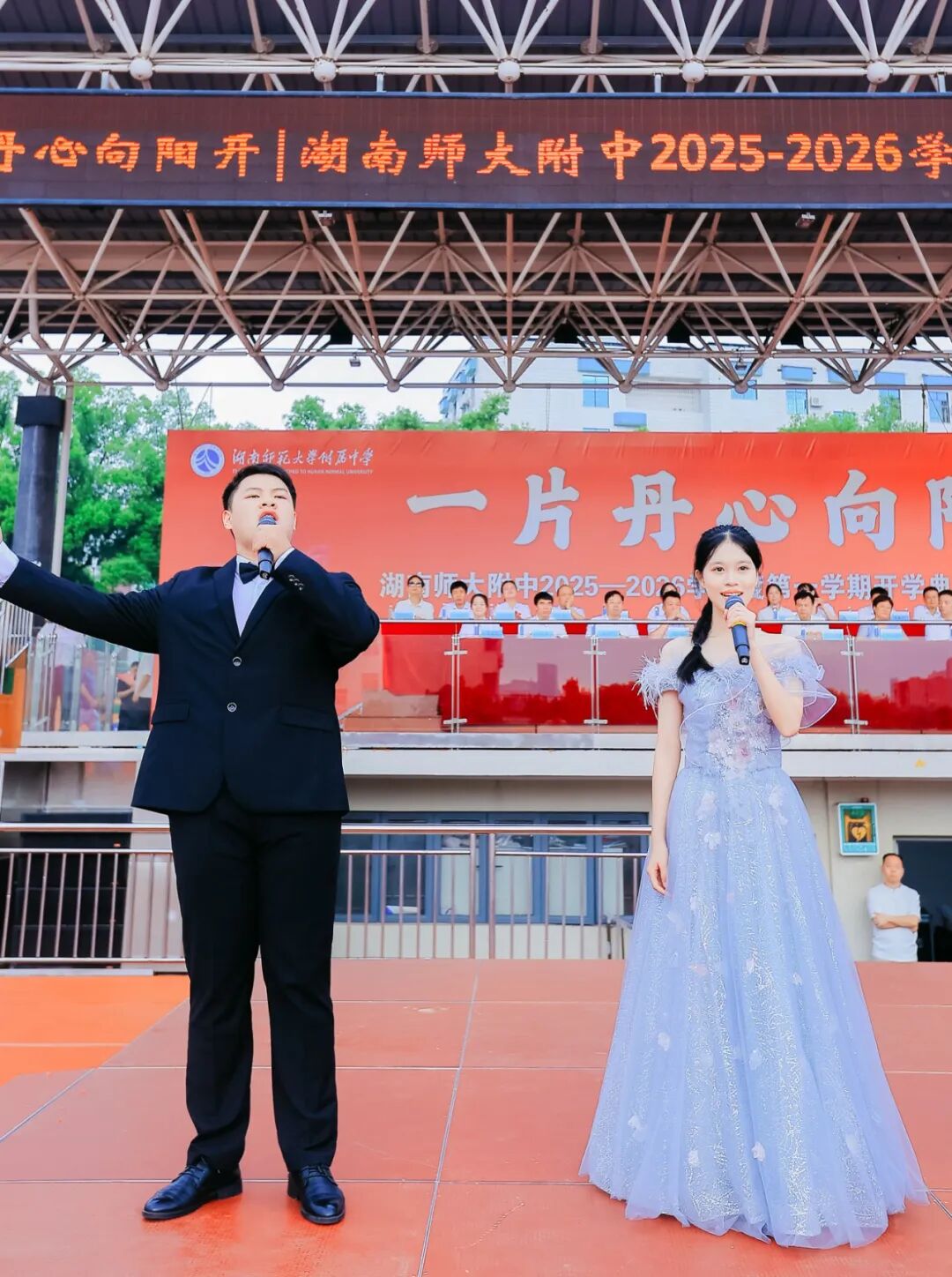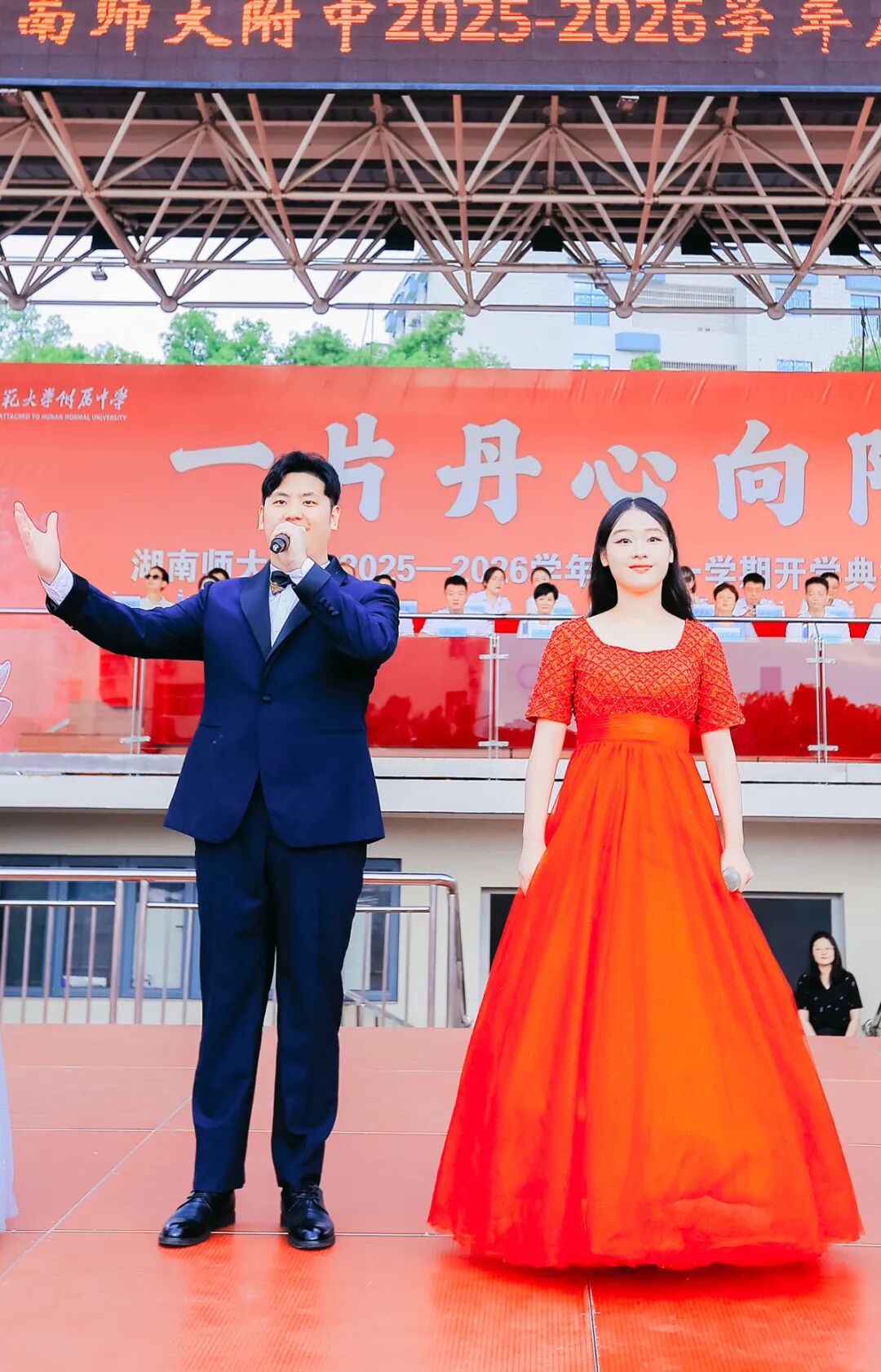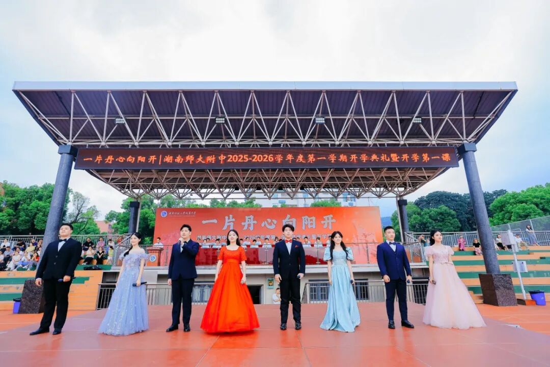 9月1日上午,湖南师范大学附属中学举行2025—2026学年度开学典礼暨开学第一课。湘江新区桔子洲街道工委委员、组织委员、学堂坡社区第一书记余海燕,湖南师大附中党委书记谢永红,学校纪检书记李春莲,副校长苏建祥、廖强、陈胸怀、许小平,挂职副校长刘娥,学术委员会主任赵优良,教师委员会副主任罗鹏飞,校家委会副主任冯立家,学校1991届高146班校友、中南大学湘雅医院移动医疗教育部实验室常务副主任黄伟红,校学生会主席梁韶贻,各部门负责人出席开学典礼。