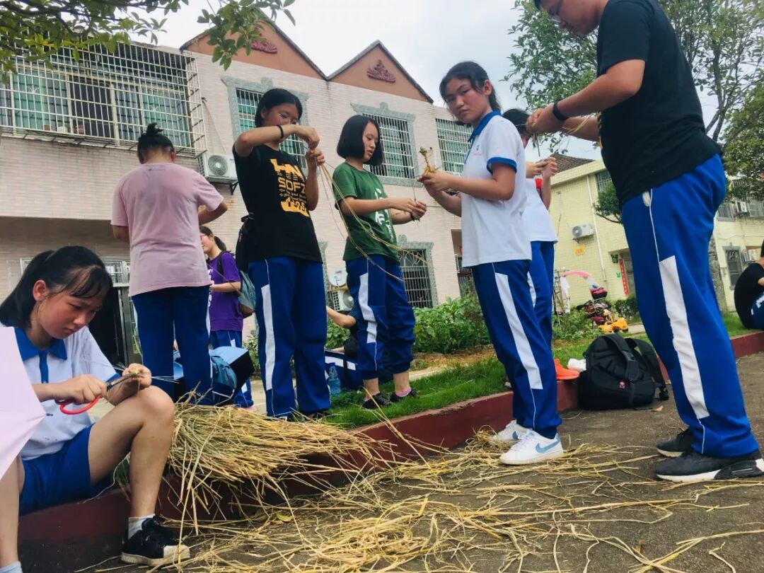 学农的经历是鲜亮、活泼,也是刻骨铭心的。来到基地后我们先学习如何扎稻草人,柔韧性极好的稻梗,黄黄的带有一丝丝清香。一圈一圈穿行于指间。在教练的指导下,不需多时,一个生动可爱的小人儿便登场了。同学们不禁喟叹农民的智慧,惊喜于自己亲手创造的作品。